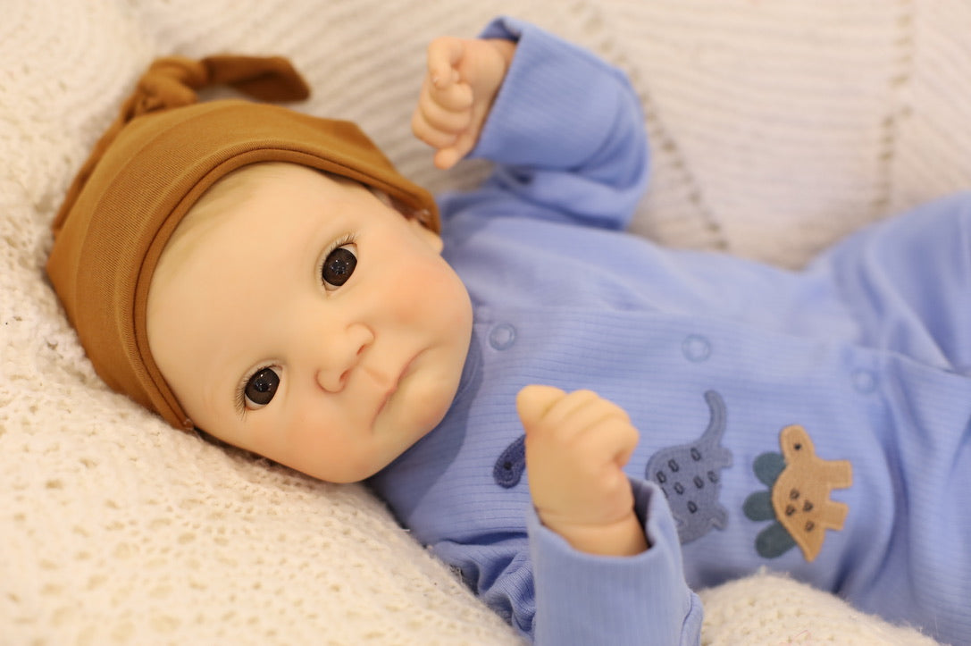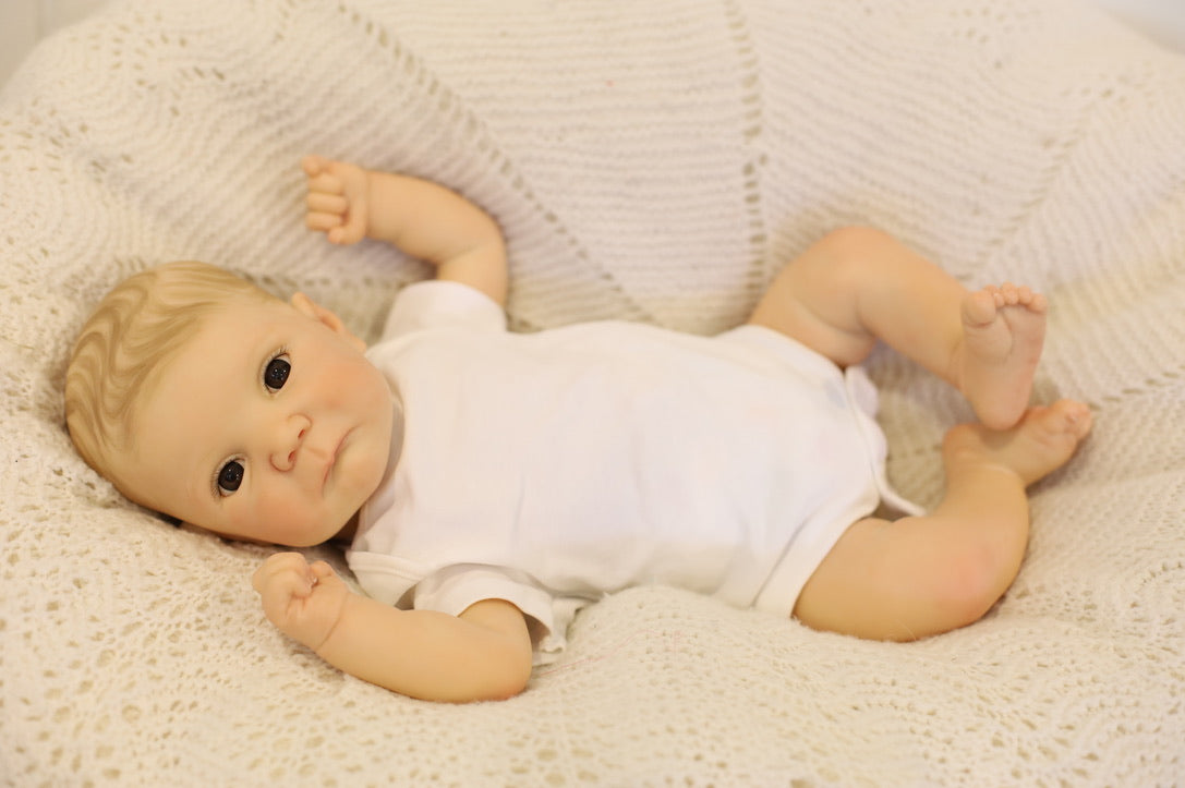 He has been hand painted at Aliyah's Playborn World by our team of talented reborn artists. Many, many layers of paint have brought this precious baby to life, making him look and feel just like a real baby.