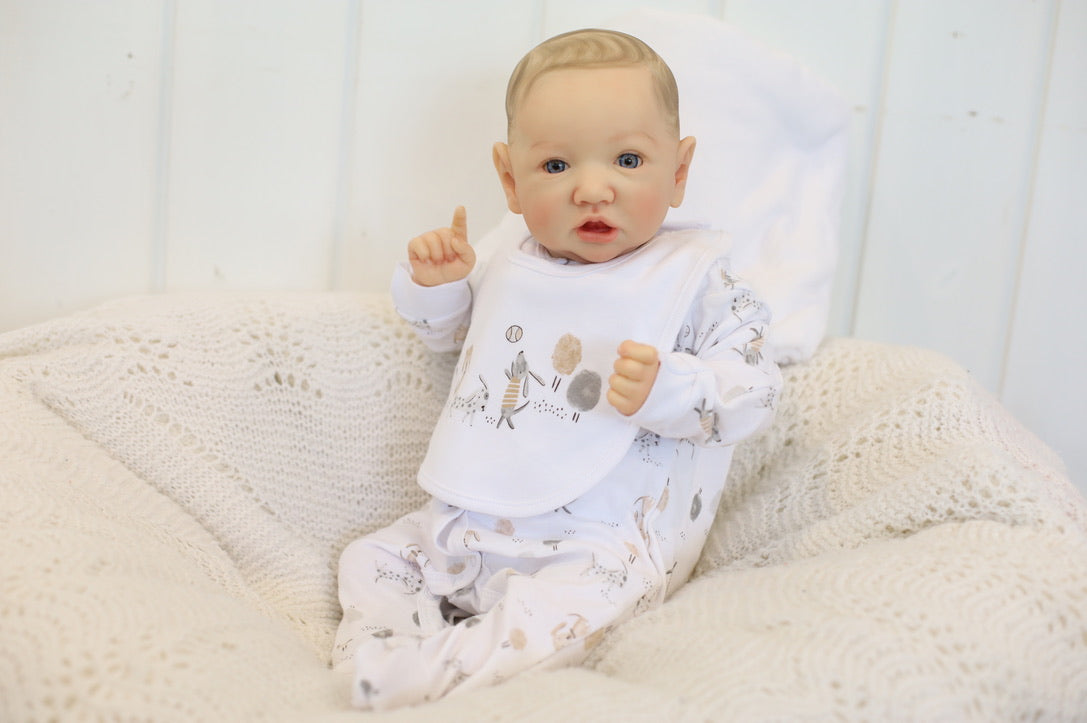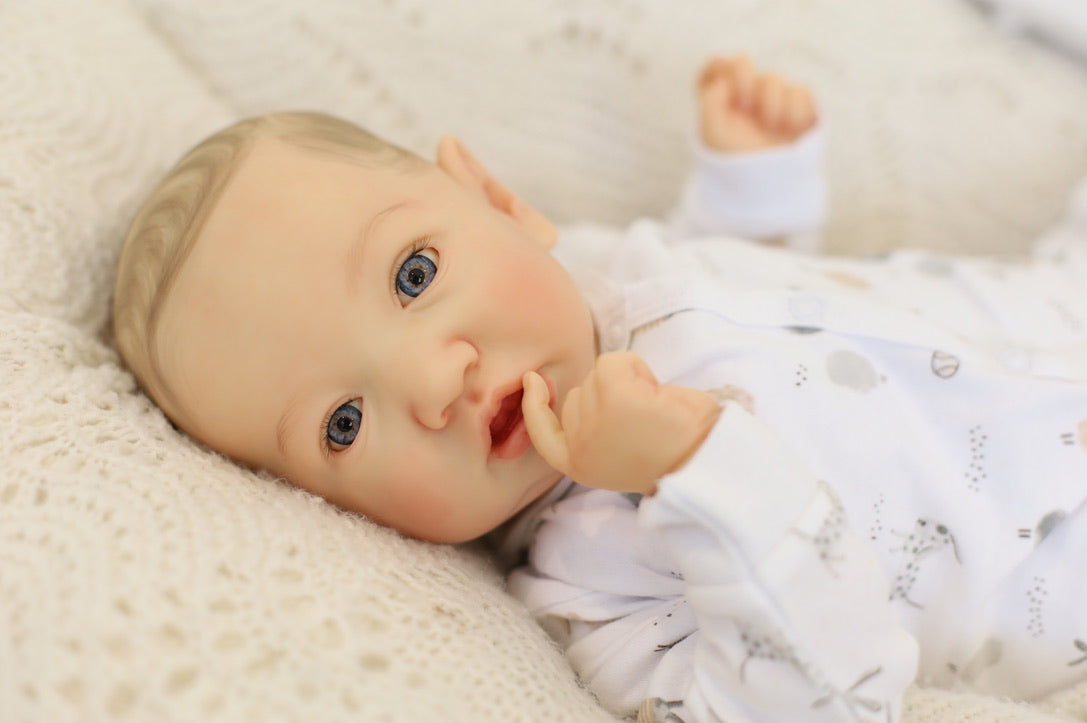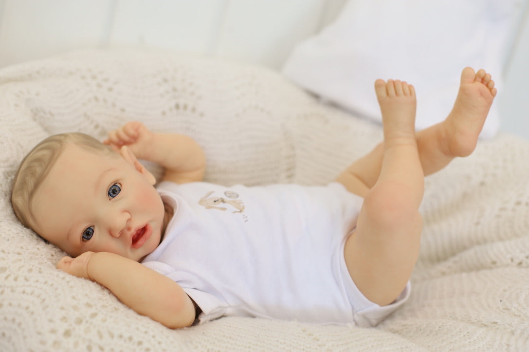 He has been hand painted at Aliyah's Playborn World by our team of talented reborn artists. Many, many layers of paint have brought this precious baby to life, making him look and feel just like a real baby.