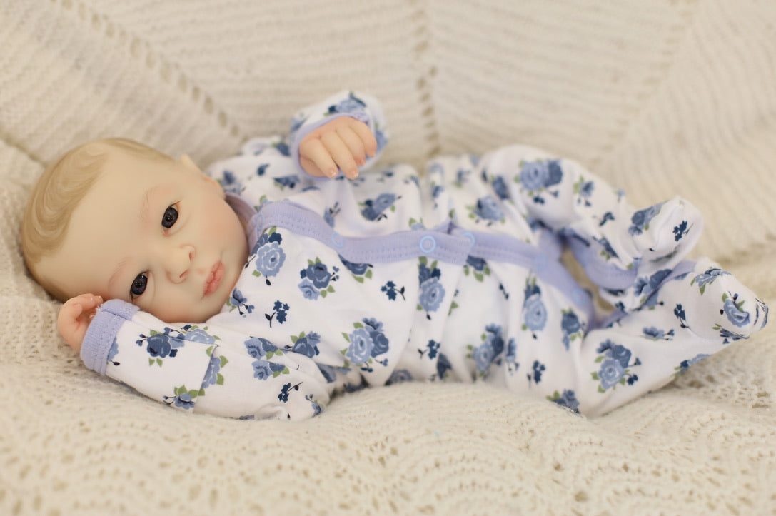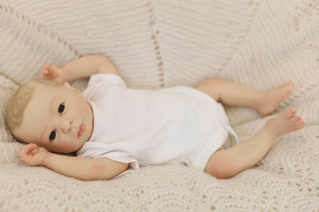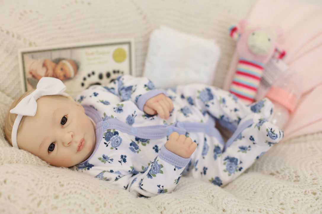 She has been hand painted at Aliyah's Playborn World by our team of talented reborn artists. Many, many layers of paint have brought this precious baby to life, making her look and feel just like a real baby.