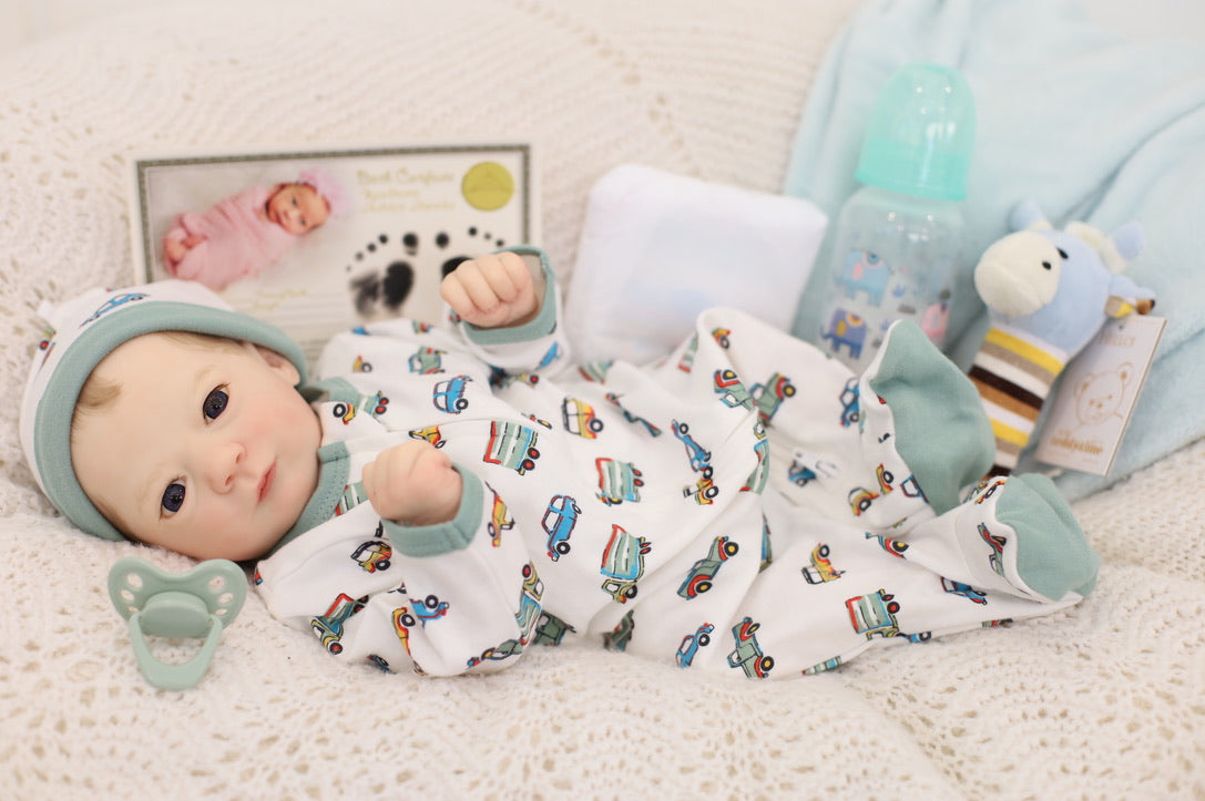 He has been hand painted at Aliyah's Playborn World by our team of talented reborn artists. Many, many layers of paint have brought this precious baby to life, making him look and feel just like a real baby.