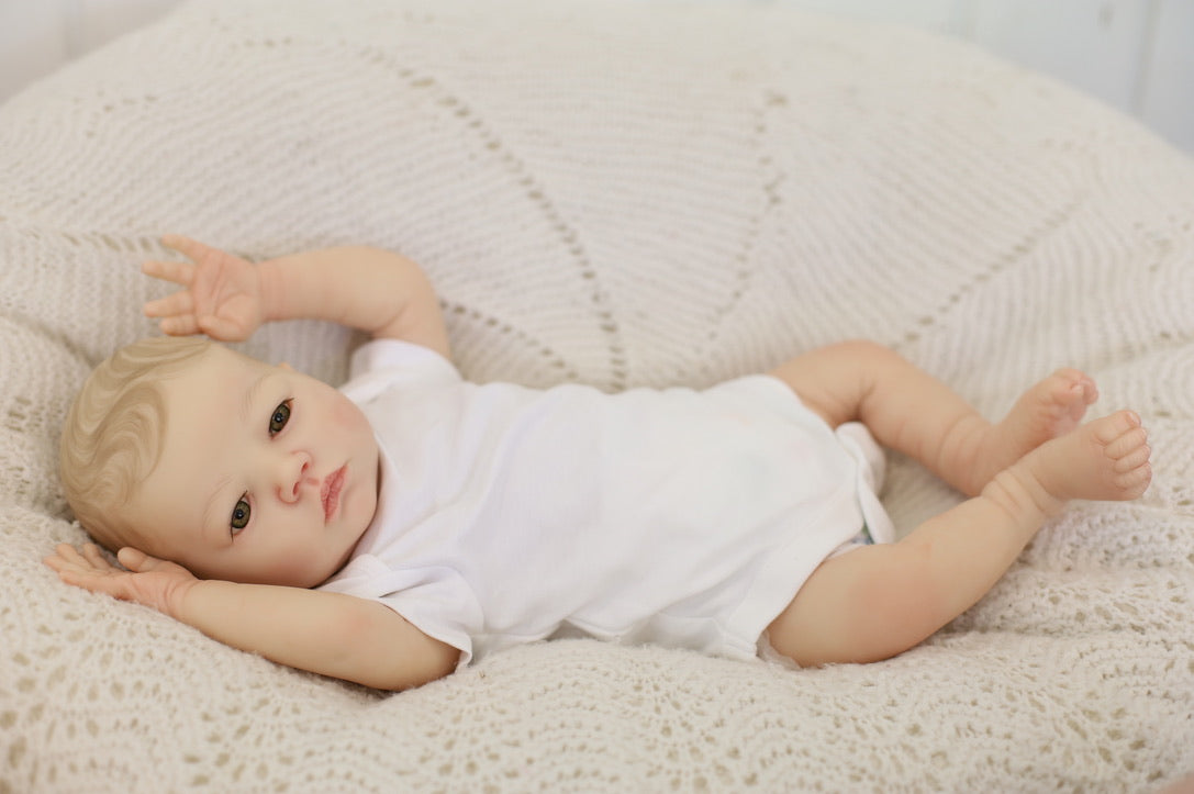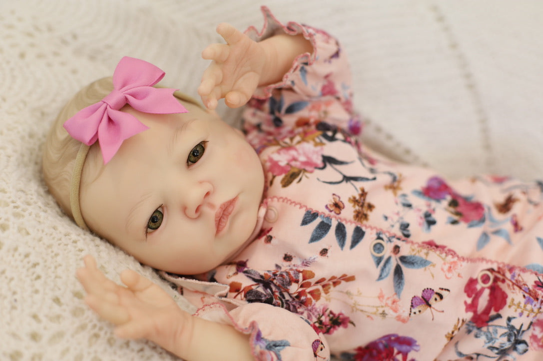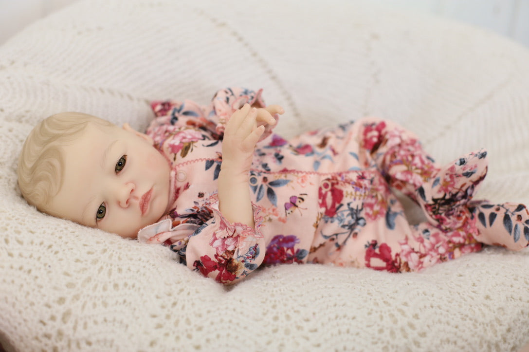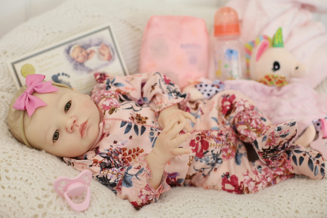 She has been hand painted at Aliyah's Playborn World by our team of talented reborn artists. Many, many layers of paint have brought this precious baby to life, making her look and feel just like a real baby.
