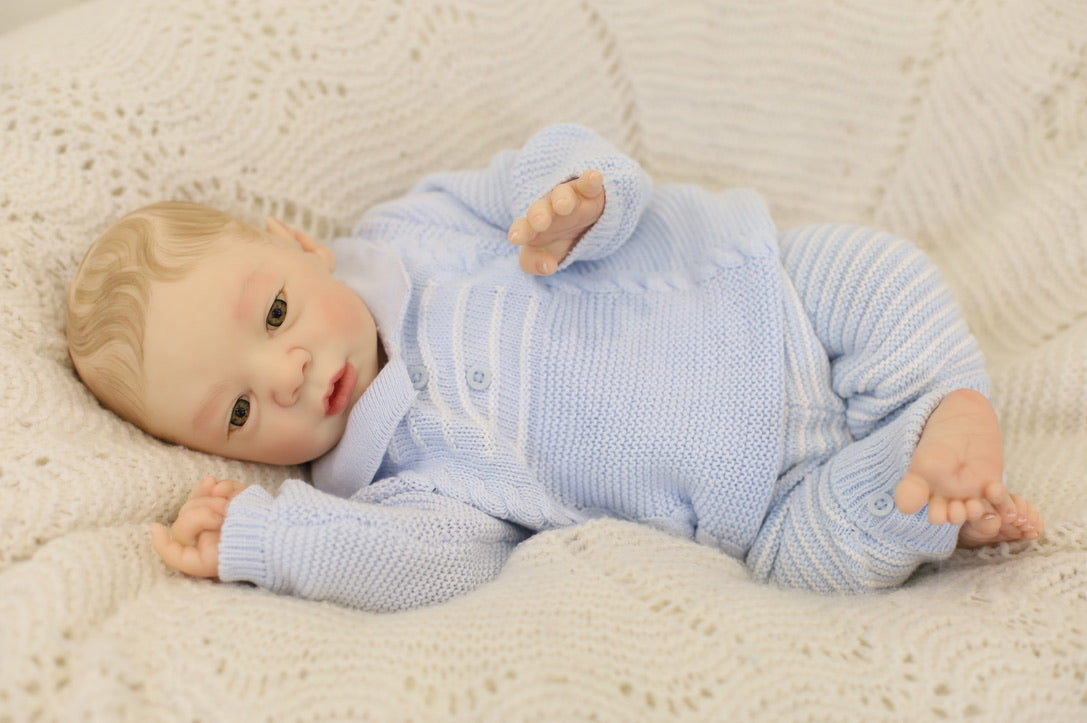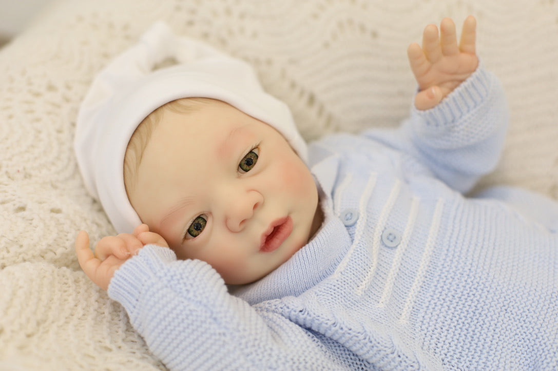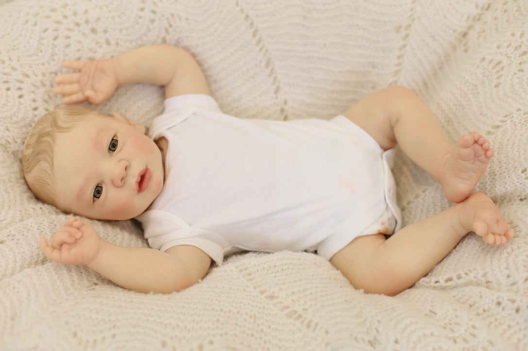 He has been hand painted at Aliyah's Playborn World by our team of talented reborn artists. Many, many layers of paint have brought this precious baby to life, making him look and feel just like a real baby.