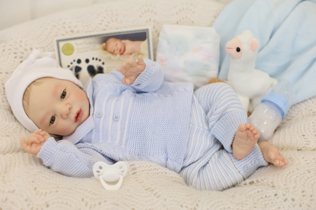Dominic will come home with the outfit he is wearing, magnetic dummy/pacifier, two nappies/diapers, blanket, Certificate of Authenticity and a Birth Certificate.