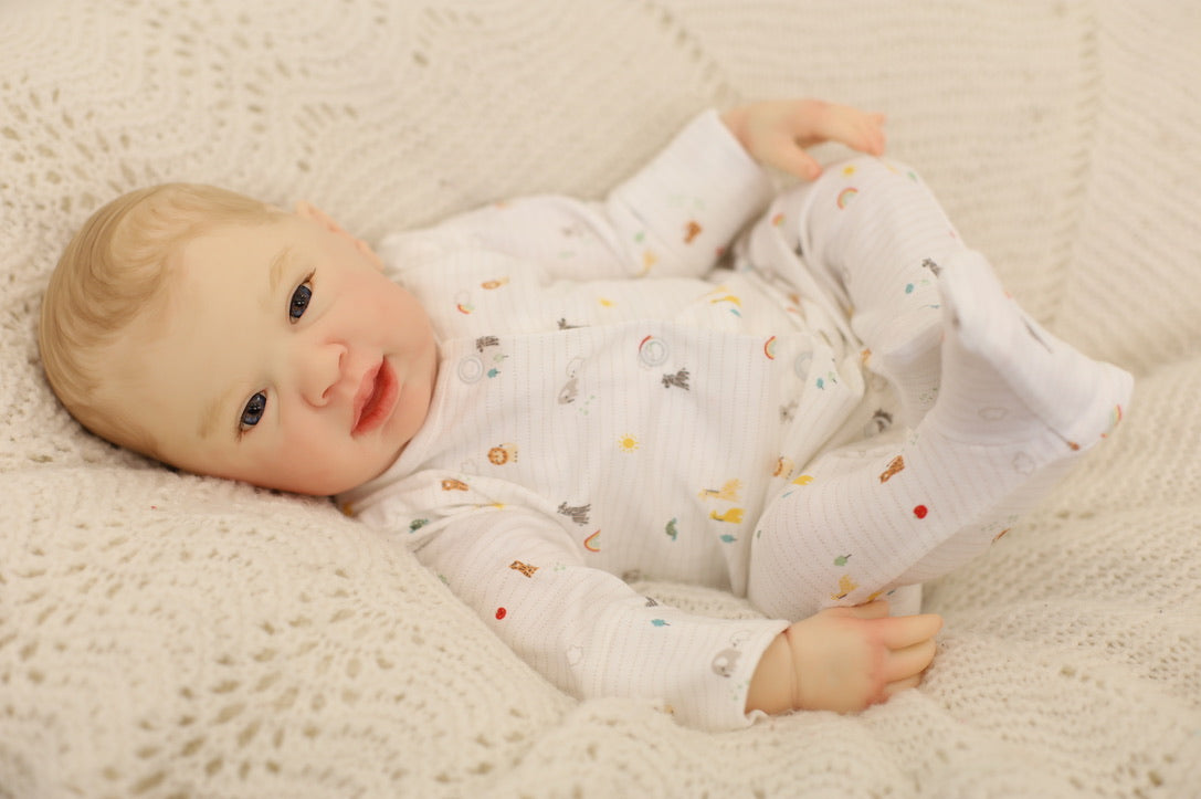 He has been hand painted at Aliyah's Playborn World by our team of talented reborn artists. Many, many layers of paint have brought this precious baby to life, making him look and feel just like a real baby.