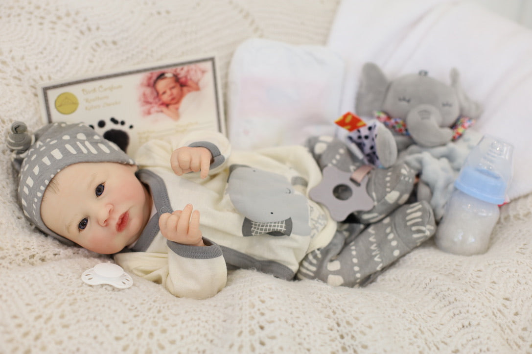 He's ready for adoption and will come with with the outfit he is wearing, a magnetic dummy/ pacifier, two nappies/diapers, toy, bottle, blanket, Certificate of Authenticity and Birth Certificate.
