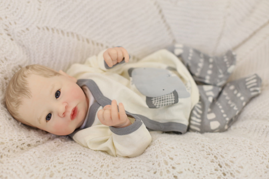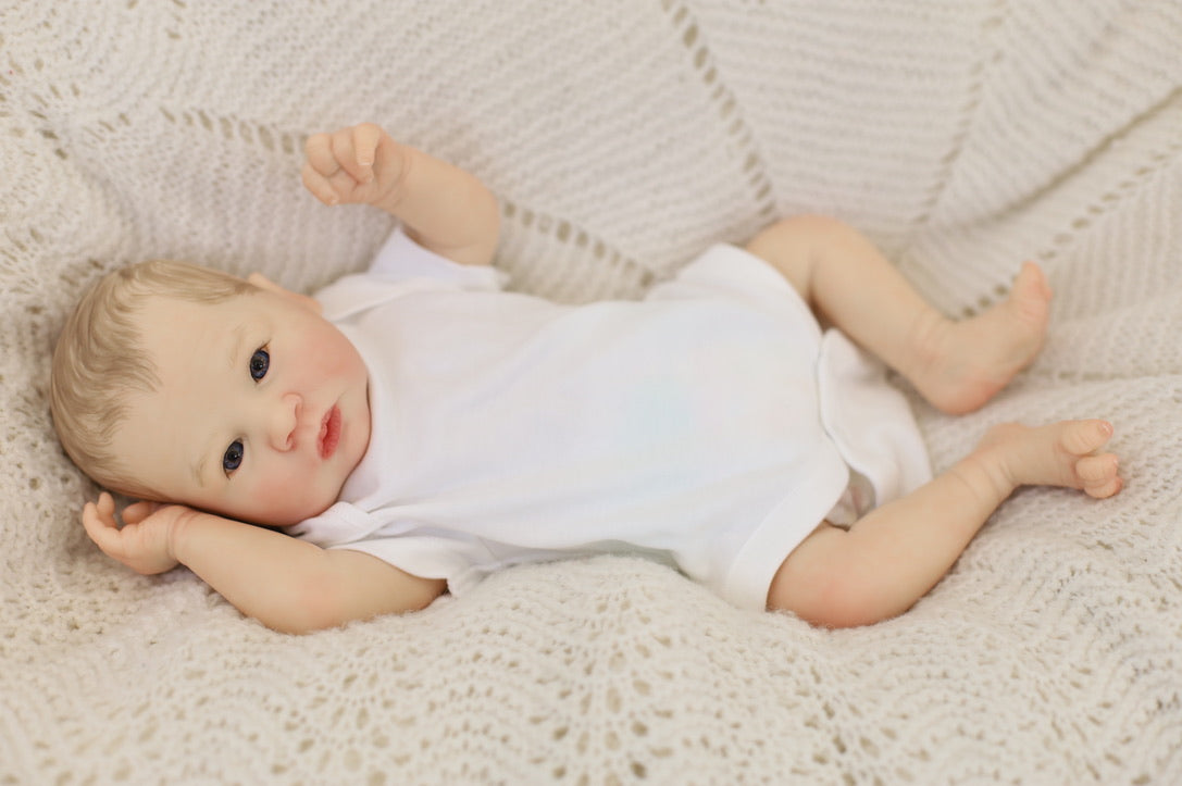 He has been hand painted at Aliyah's Playborn World by our team of talented reborn artists. Many, many layers of paint have brought this precious baby to life, making him look and feel just like a real baby.