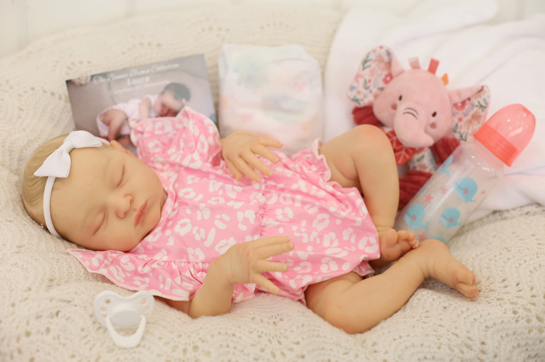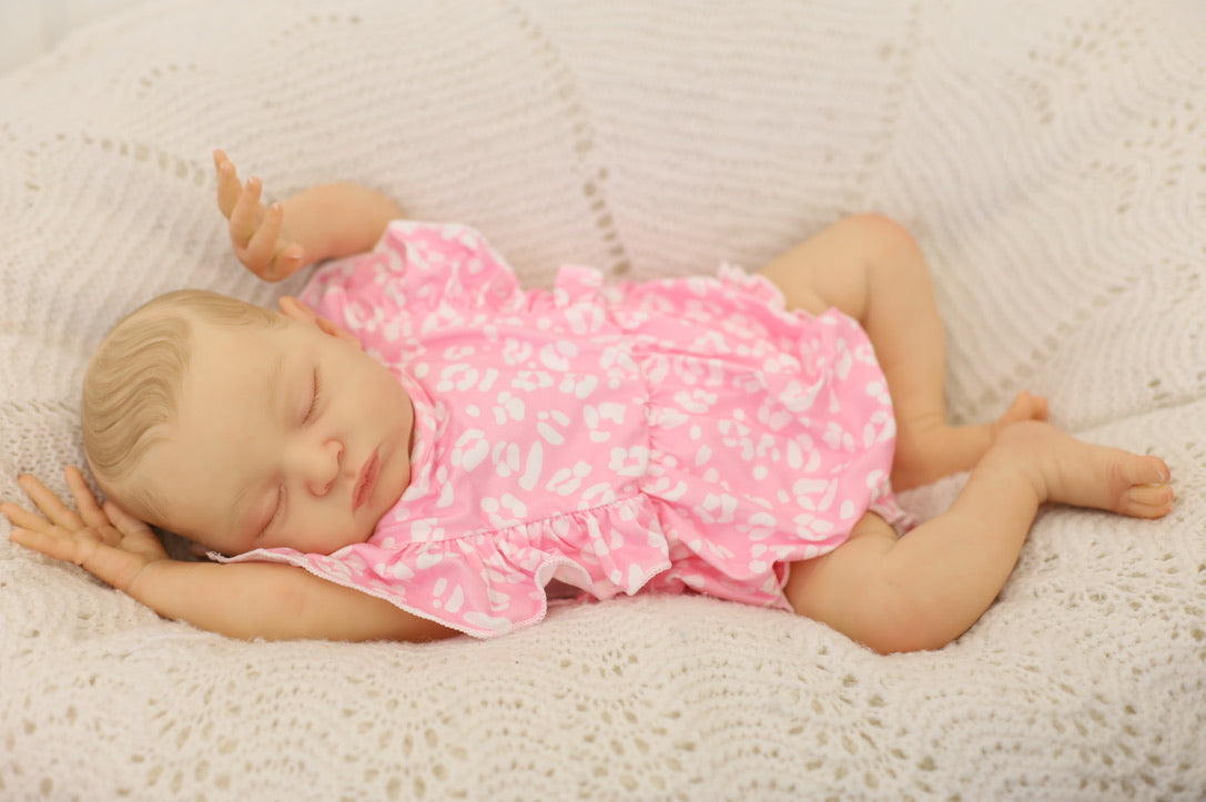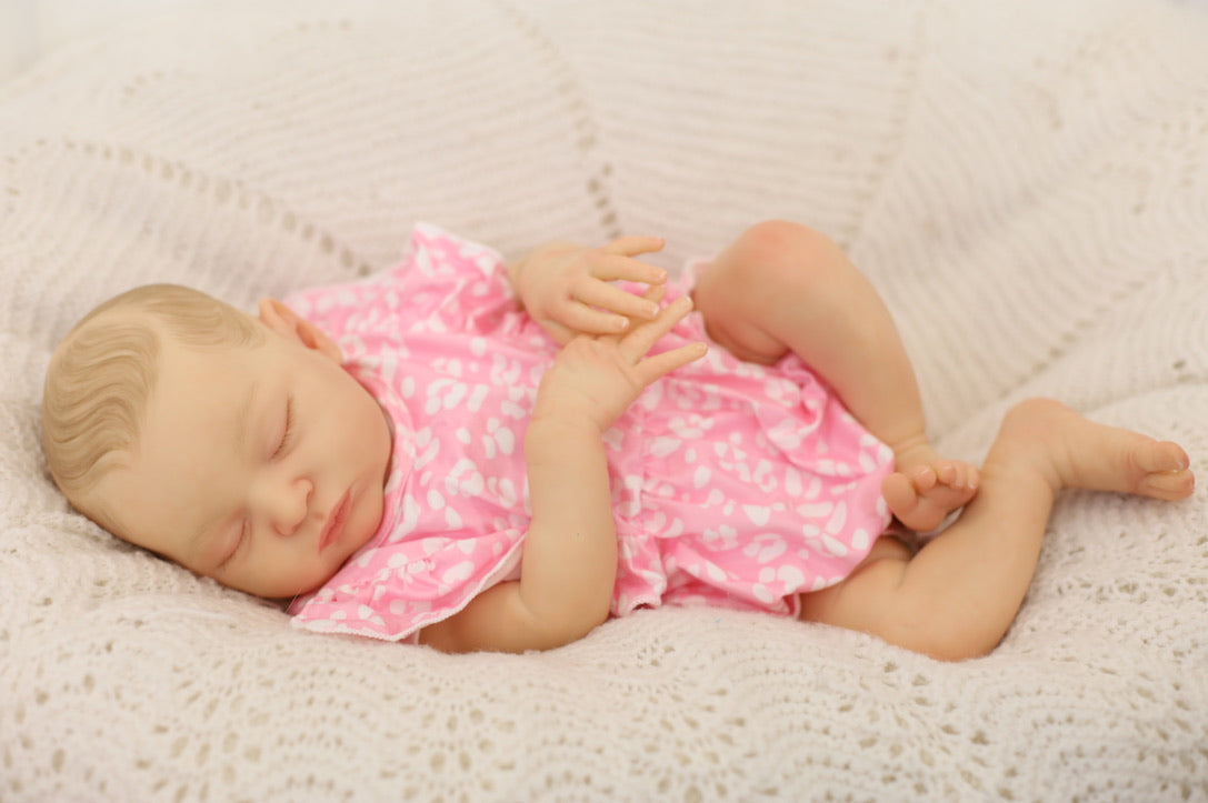 She has been hand painted at Aliyah's Playborn World by our team of talented reborn artists. Many, many layers of paint have brought this precious baby to life, making her look and feel just like a real baby.