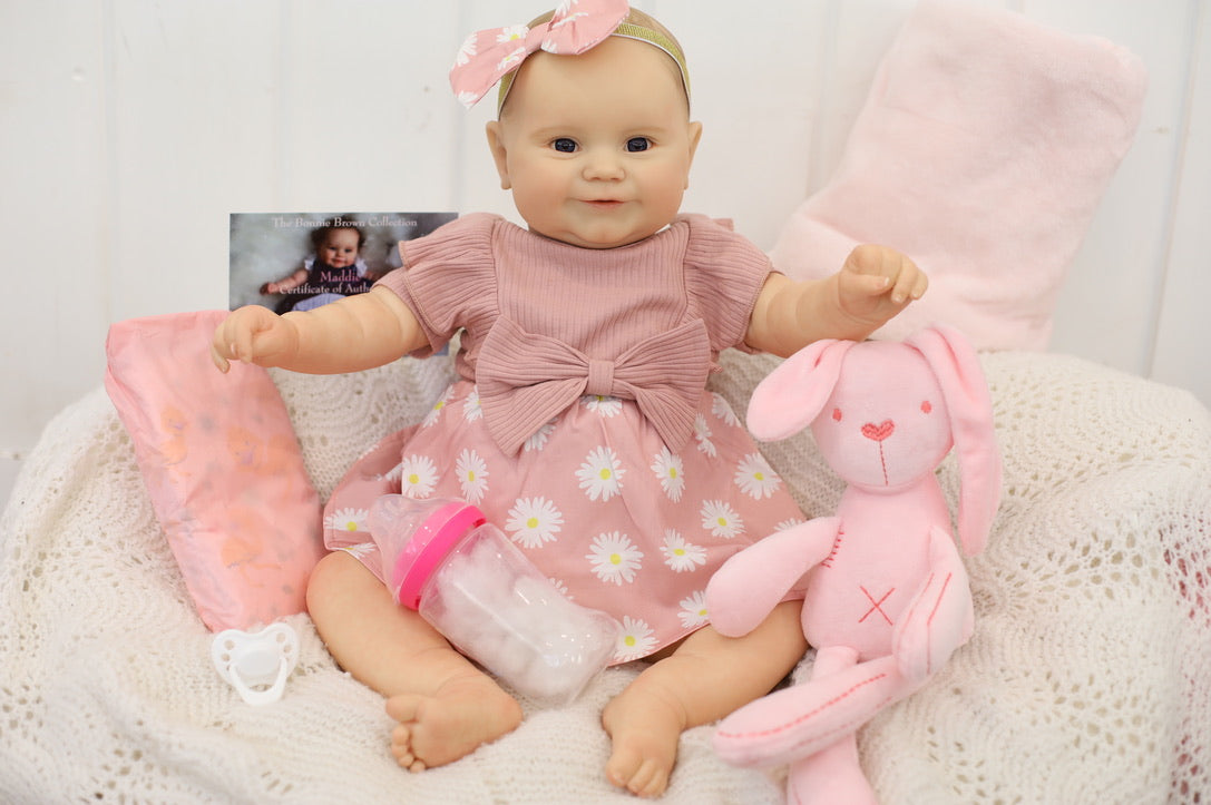 Maddie will come home with the outfit she is wearing, magnetic dummy/pacifier, two nappies/diapers, toy, bottle, blanket, Certificate of Authenticity and Birth Certificate.
