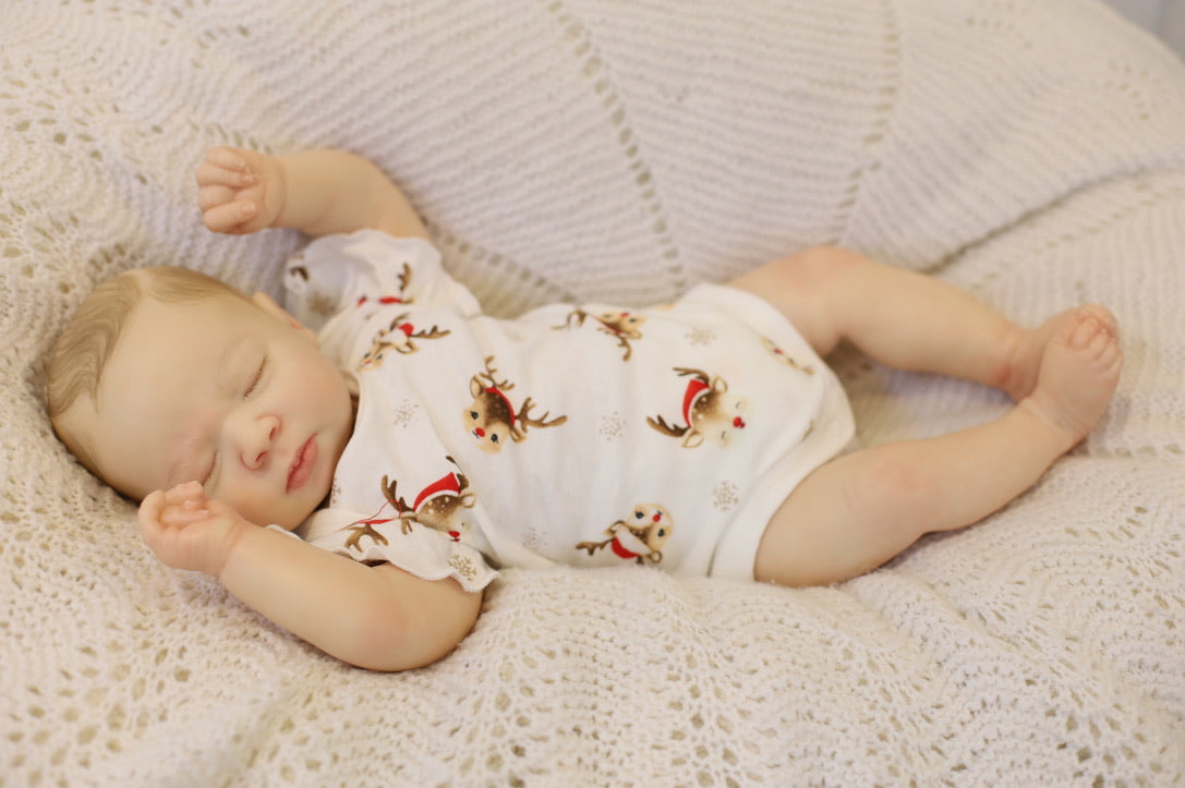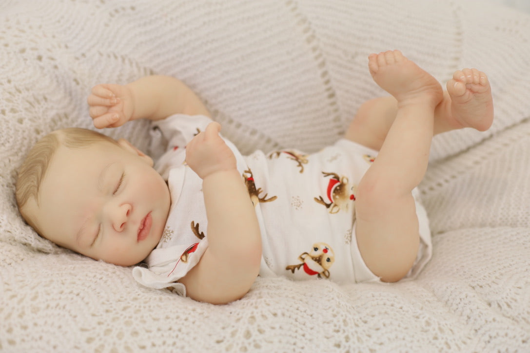 She has been hand painted at Aliyah's Playborn World by our team of talented reborn artists. Many, many layers of paint have brought this precious baby to life, making her look and feel just like a real baby.
