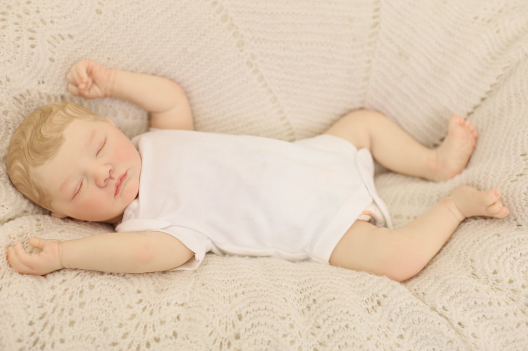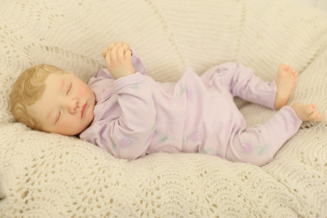 She has been hand painted at Aliyah's Playborn World by our team of talented reborn artists. Many, many layers of paint have brought this precious baby to life, making her look and feel just like a real baby.