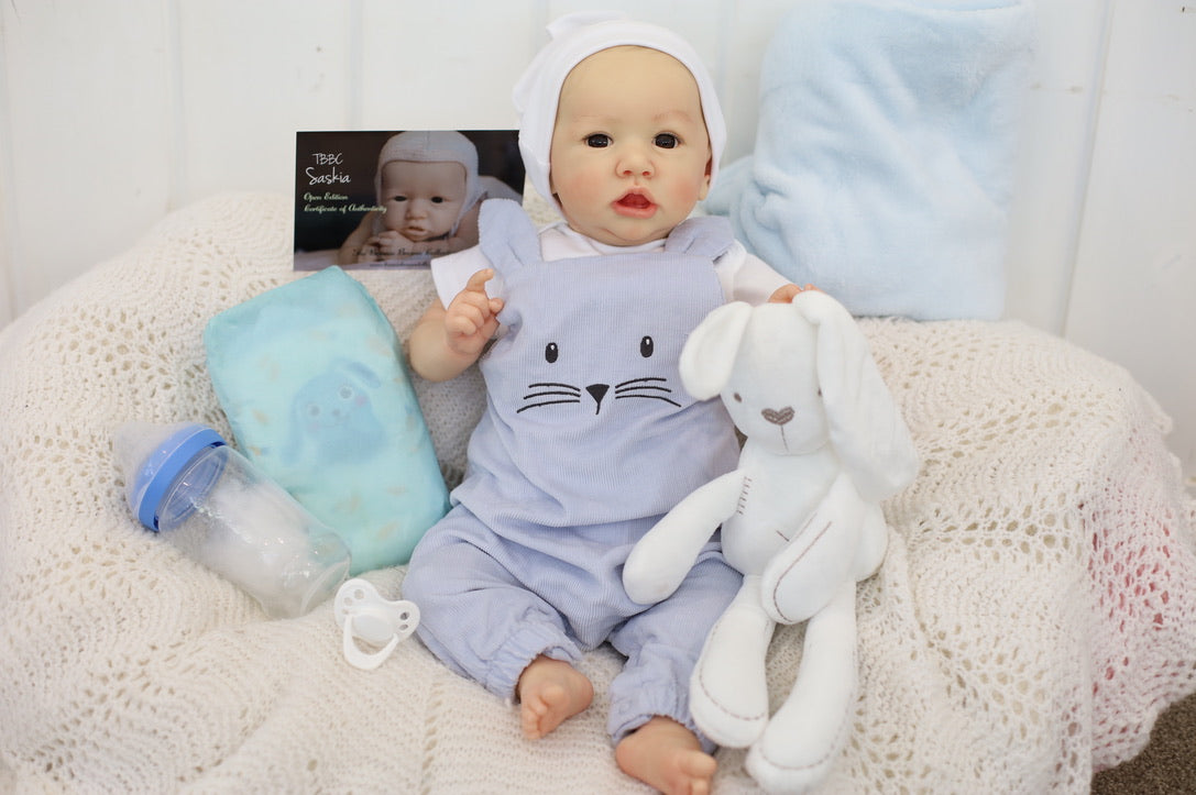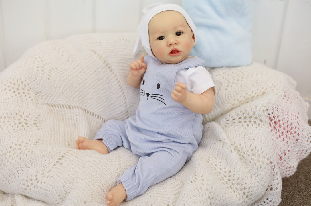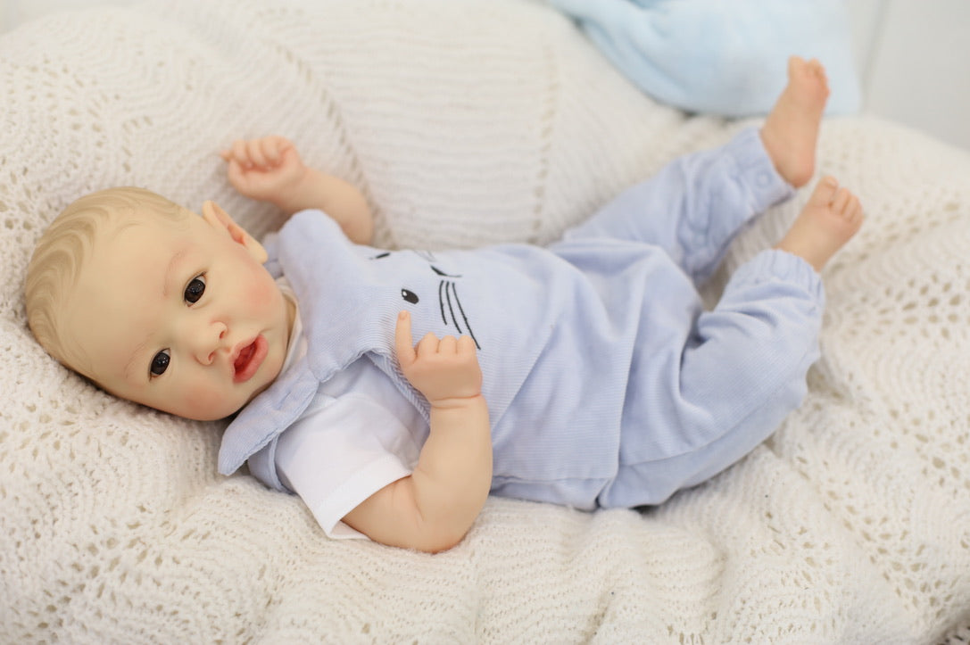 He has been hand painted at Aliyah's Playborn World by our team of talented reborn artists. Many, many layers of paint have brought this precious baby to life, making him look and feel just like a real baby.